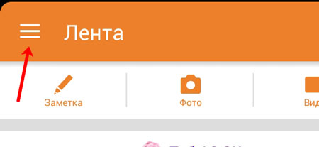 Якщо ви використовуєте мобільний додаток для входу в Однокласники, то зайдіть на свою сторінку. Потім відкрийте бічне меню, натиснувши в правому верхньому куті на кнопочку із зображенням трьох горизонтальних прямих.