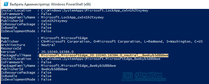 після цього перед вами відкриється список характеристик операційної системи, а також всі встановлені програми. Серед нього знаходимо Microsoft.MicrosoftEdge. Далі нам слід скопіювати його значення в полі Package FullName. Після цього слід прописати наступну команду в повершелл: