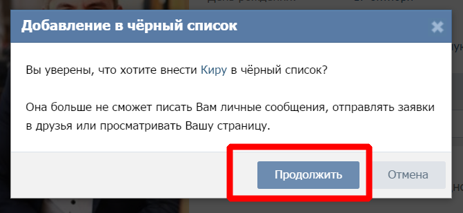 З’явиться вікно з підписаними на вас людьми. Вибираємо тільки що віддаленого людини, навівши на нього курсор миші, і натискаємо на хрестик у куточку мініатюри з його фото. Потім підтверджуємо дію натисканням кнопки «Продовжити». Так, людина перейде в «Чорний список».