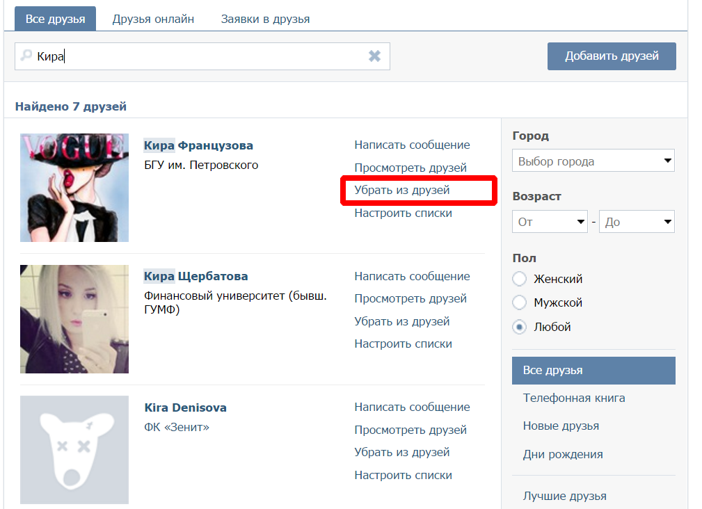 Пишемо в рядку пошуку ім’я чи прізвище того, кого хочемо видалити. Список тут же видасть нам рядок з мініатюрою потрібної людини.Навпаки фотографії одного буде ряд ссилочек, які дозволяють виконувати різні дії. Натискаємо на посилання «видалити з друзів».
