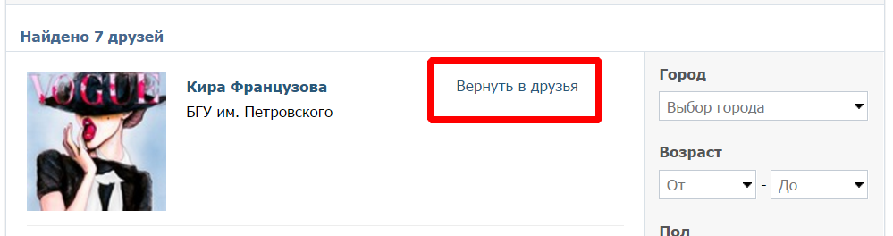 Після натискання даної посилання всі інші дії стануть неможливі. Однак, з’явиться невелика ссилочка «Повернути в друзі», яка дозволить знову внести людини в список друзів, якщо він був вилучений помилково. Але це можливо лише поки ви знаходитесь в розділі «Мої друзі», якщо ви вийшли з нього, то моментальне відновлення буде неможливо.
