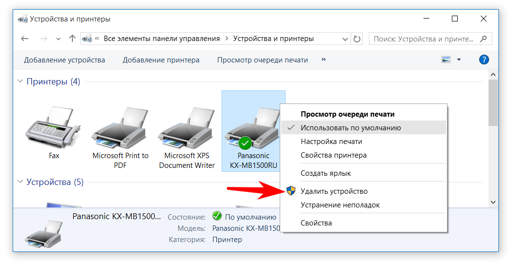 - У віконці, що з’явилося вибираємо потрібний принтер і клікаєм по ньому пр. кнопкою мишки. У меню вибираємо рядок «Видалити пристрій».