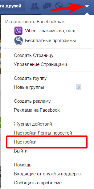 - Зайдіть у свій профіль. На синій панелі, розташованої у верхній частині сторінки, можна побачити маленький значок трикутника (крайній праворуч). Натискаємо на нього.