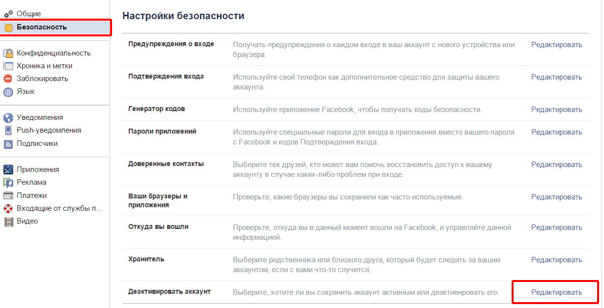 - Навпроти останнього пункту «Деактивувати аккаунт» клацаємо по ссилочку «Редагувати». Потім клацаємо по ссилочку «Деактивувати аккаунт», вона з’явиться трохи нижче.