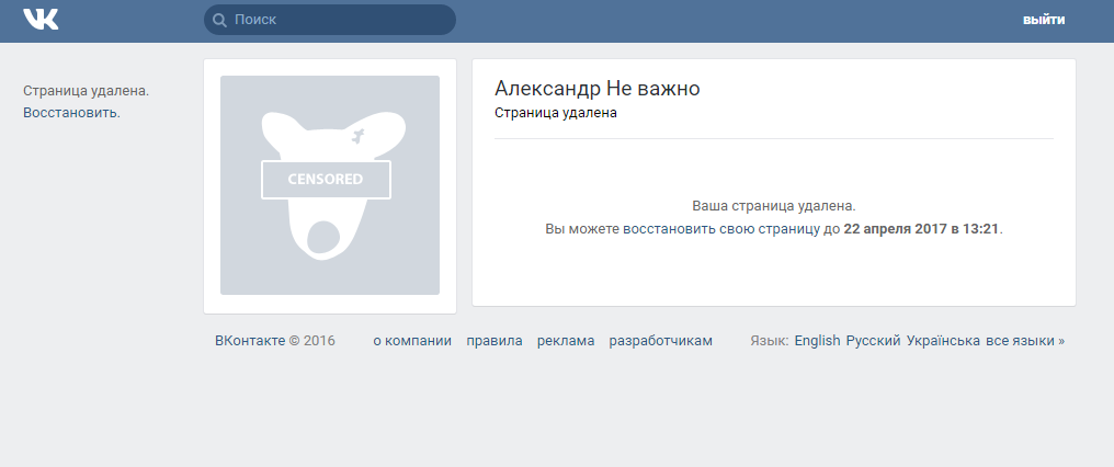 Вконтакті не бажає відпускати вас з своїх мереж і пропонує повернутися, виділяючи 6 місяців на роздуми. Відновлення сторінки не складає ніяких труднощів і всі дані, які були на момент видалення нікуди не подінуться. Можна 6 місяців відпочити і знову силами влитися в ряди користувачів.