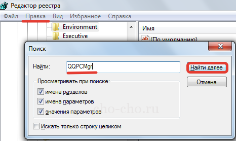 Входимо в нього, потім у «Правка» і «Пошук» (або ж поєднання Ctrl + F). Пишемо QQPCMgr, qqpctray.exe, tencent.