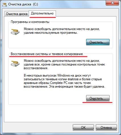 - Перед вами має відкритися віконце «Очищення», вам потрібно буде відкрити вкладку «Додатково», перед вами відкриється розділ «Відновлення та тіньове копіювання», тут перед вами відкриється іконка «Очистити».
