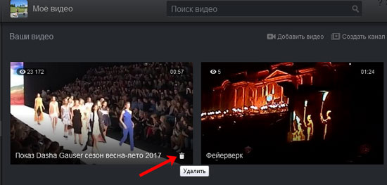 Після того, як знайдете непотрібне відео, наведіть на нього мишкою. У правому нижньому куті з’явиться кошик «Видалити», натисніть на неї.