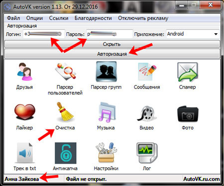 Запустіть AutoVK. Головне вікно програми виглядає наступним чином, але перш, ніж почати вивчати функціонал, потрібно виконати авторизацію. У поля «Логін» та «Пароль» введіть дані від своєї сторінки Вконтакті, та натисніть кнопку «Авторизація». В результаті, в лівому нижньому куті Ви повинні побачити ім’я свого профілю.