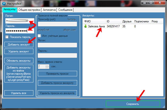 На вкладці «Облікові записи» потрібно додати свою сторінку. Для цього в поле «Логін» і «Пароль» введіть дані свого облікового запису Вконтакте і натисніть «Додати запис». Якщо все зробили правильно, тоді праворуч в полі з’явиться ім’я сторінки, id, кількість друзів і підписок. Натисніть на кнопочку «Зберегти» в правому нижньому куті.