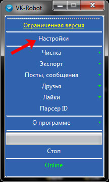 Заходимо в програму. Головне вікно VK-Robot виглядає наступним чином. Першим ділом клацніть на кнопку «Налаштування».