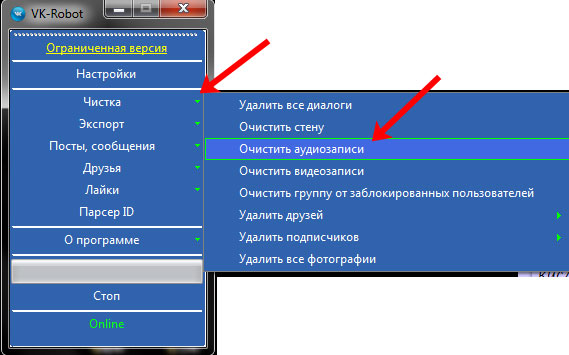 Знову повертаємося до головного вікна програми VK-Robot. З меню виберіть пункт «Чистка» і натисніть навпроти нього на зелену стрілочку. Далі з випадаючого списку виберіть «Очистити аудіозаписи».