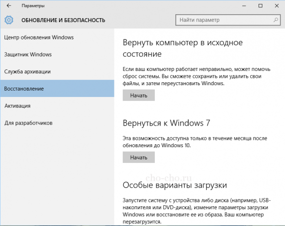 Для початку запустіть «Параметри» і перейдіть в розділ «Оновлення та безпека». Перед вами виникне віконце, яке містить кілька підрозділів, вибирайте «Відновлення». Натиснувши на неї, ви побачите кілька варіантів. Нас цікавить варіант «Повернутися до Windows 7» (Windows 8, в залежності чим ви користувалися раніше). Натисніть «Почати».