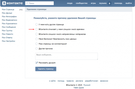 Тепер у вас питає причину видалення вашої сторінки. Радимо вказати: ВКонтакте віднімає у мене занадто багато часу. Тоді буде менше запитань від системи.