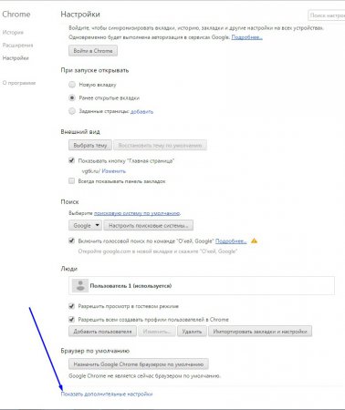 2. Відкриється вкладка “Налаштування”, з якою ми вже раніше знайомилися, коли змінювали шлях завантаження файлів, міняли головну сторінку, прибирали рекламу з YouTube. Тепер же нам необхідно почистити збережені паролі. Відповідно вам необхідно натиснути на кнопку “Показати додаткові параметри“.