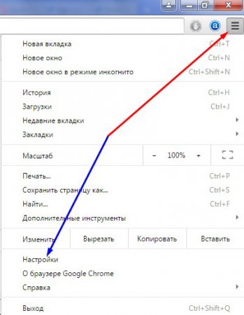 1. Запустіть браузер. Потім натисніть кнопку “Настройка і управління Google Chrome” і в контекстному меню виберіть “Налаштування“.