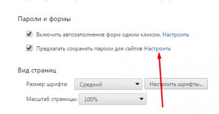 3. З’являється ще різні параметри. Вам же необхідно відшукати розділ “Паролі і форми”, а в ньому, біля опції “Пропонувати зберегти пароль” натиснути на посилання “Налаштувати”.