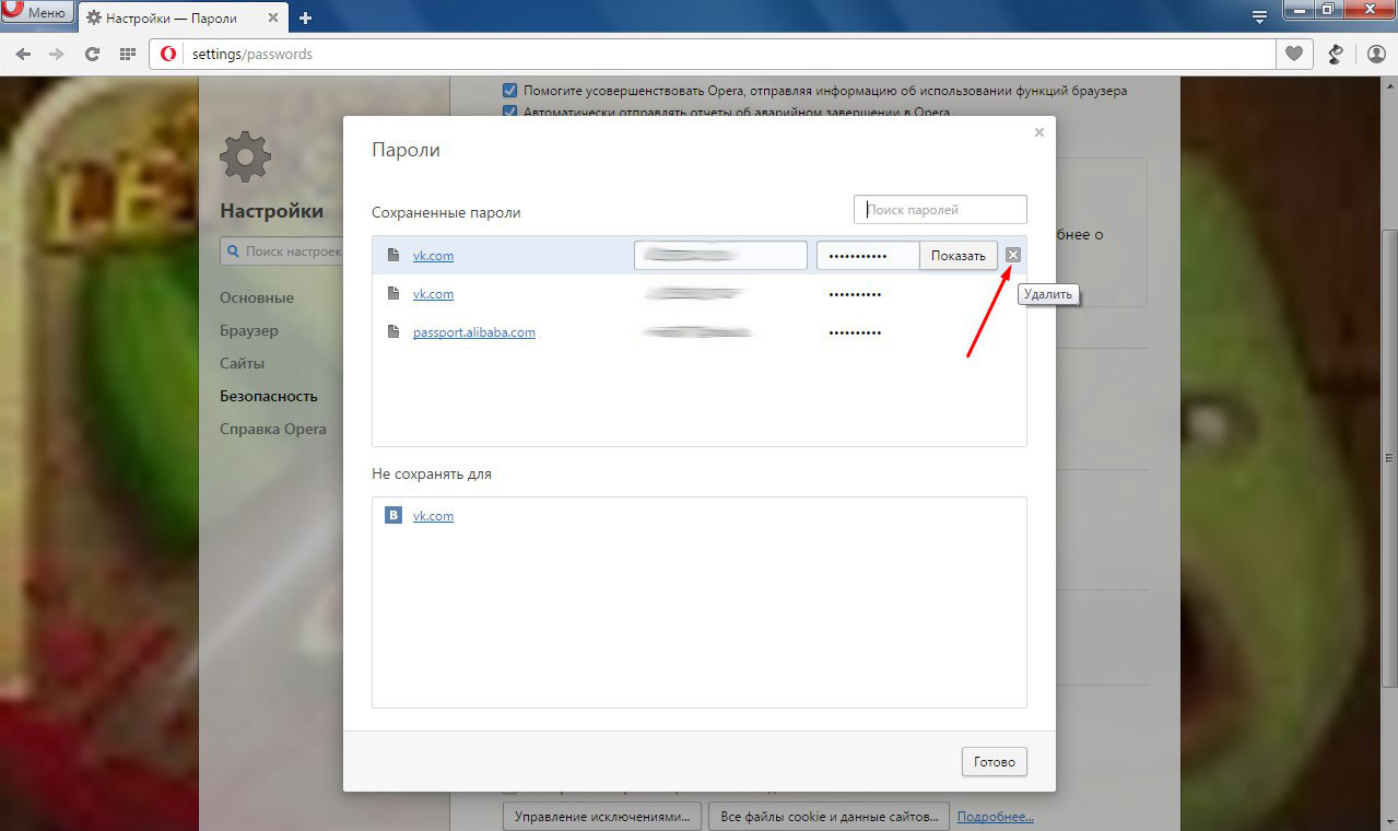 - Видаляємо всі паролі, які необхідно. Для цього просто натискаємо зображення хрестика, яке з’являється праворуч від запису при наведенні курсору.