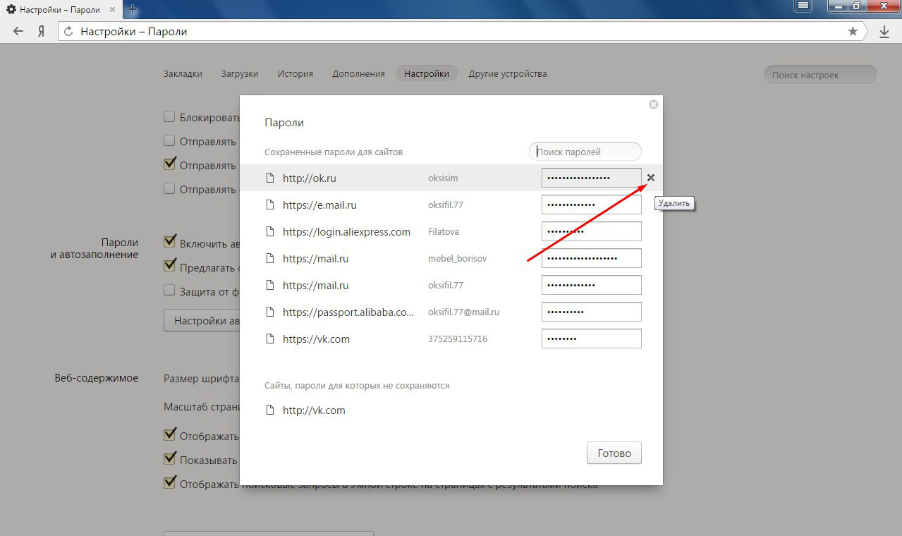 - Відкриється вікно, де можна буде побачити сайти і збережені паролі. Видаляємо ті, які потрібно, клікаючи по хрестику праворуч від запису.