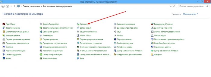 Для початку зайдіть в «Панель управління». Потім встановіть перегляд на «дрібні значки». Тепер знайдіть параметр «Автозапуск». Відкриваємо його.