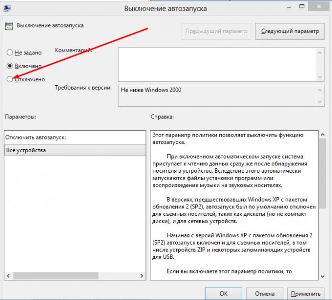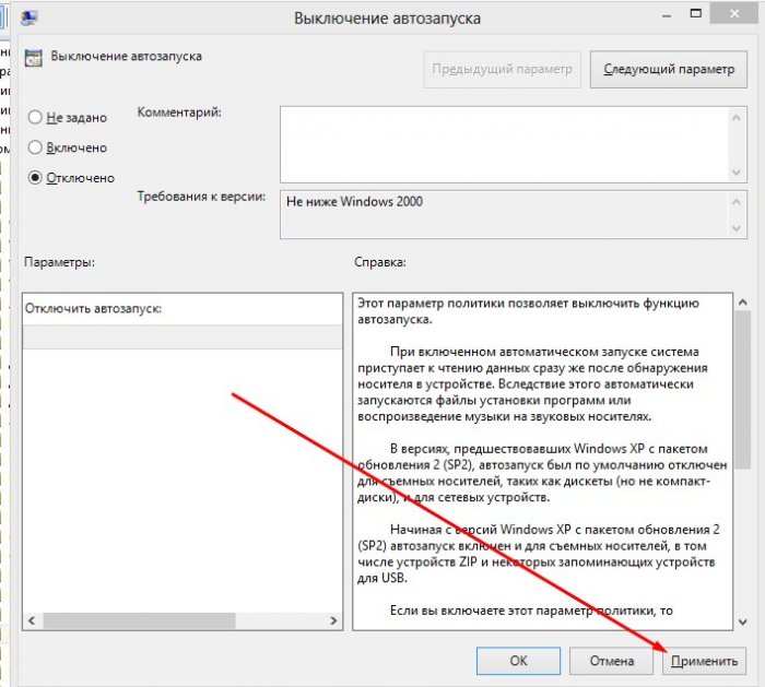 Після чого відкриється нове діалогове вікно «Вимикання автозапуску». У верхньому лівому кутку 3 стану цього параметра «Не встановлено», «Включено» та «Відключено». Ви, напевно, вже здогадалися, що вам необхідно встановити прапорець навпроти «Відключено».