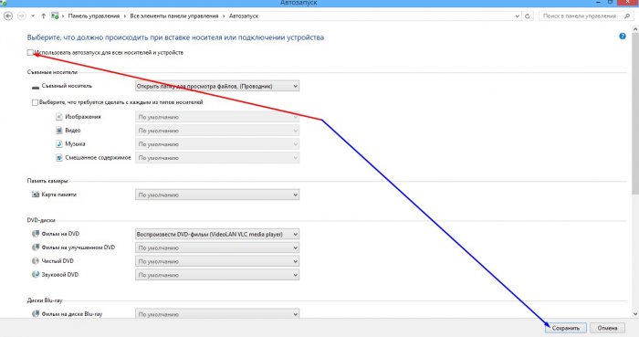 Для тих, хто хоче просто відключити автозапуск флешок та інших пристроїв рекомендую просто прибрати прапорець з пункту «Використовувати автозапуск для всіх носіїв і пристроїв», який розташований в самому верху. Потім натисніть кнопку «Зберегти».