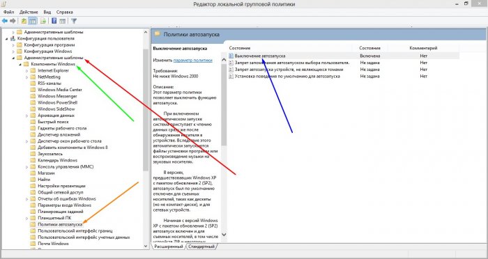 Відкриється діалогове вікно «Редактор локальної групової політики». Зліва ви побачите меню деревовидної форми. Натисніть на папку «Адміністративні шаблони», потім «Політика автозапуску». З правої сторони вікна ви побачите 4 стану. Вам необхідно відкрити перше, яке іменується «Вимкнення автозапуску».