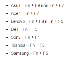 Однак загальноприйнятий стандарт — це поєднання двох незалежних клавіш FN+F7-12». Останнє значення функціональної клавіші варіюється в заданих виробником межах. Для спрощення процесу розуміння, про що тут взагалі говориться, уважно ознайомтеся з таблицею найбільш поширених схем управління активністю тачпад панелі (тут ще трохи інформації з приводу корисних клавіш).