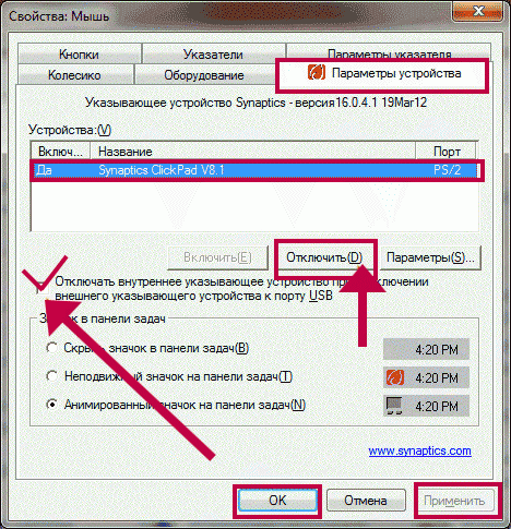 Відключення тачпад модуля за допомогою вбудованої програмної функції Synaptics