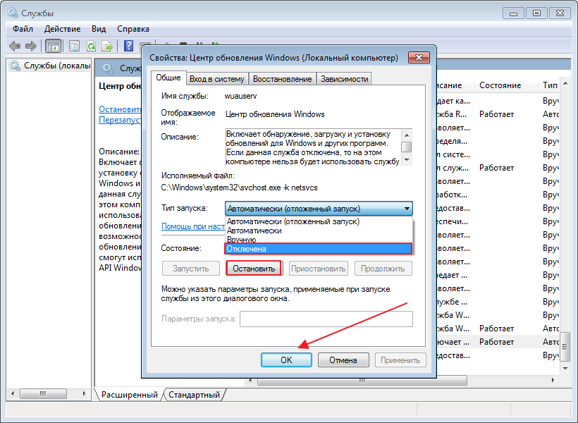 Відключаємо, а потім зупиняємо службу. Підтверджуємо.
