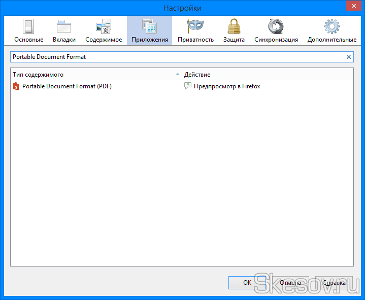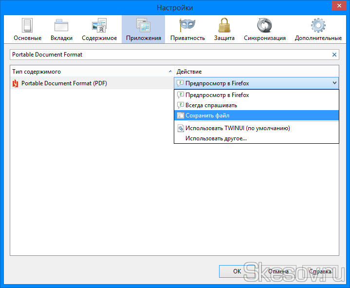 3) Вибираємо Portable Document Format (PDF) і тиснемо по трикутнику справа в правій колонці, тут вибираємо те, що ми хочемо робити з файлами PDF, вибравши останній пункт (використовувати інше) можна задати певну програму для відкриття файлів. Я віддаю перевагу вибирати «Зберегти файл», що буде викликати вікно завантаження файлу, а далі працювати з файлом як мені зручно.