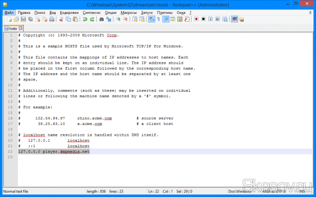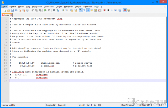 1) Отже, для того щоб позбутися від цієї панелі, нам необхідно внести невелике виправлення в файл hosts. І для тих, хто вже перейшов на Windows 8.1 (8) я рекомендую спочатку прочитати ось цю статтю про редагуванні файлу hosts в даних ОС. У Windows 7 проблем зазвичай немає, але якщо ви побачите про нестачу прав доступу, теж проходьте за посиланням. Отже, відкриваємо в текстовому редакторі файл hosts. Він знаходиться за наступним шляхом: