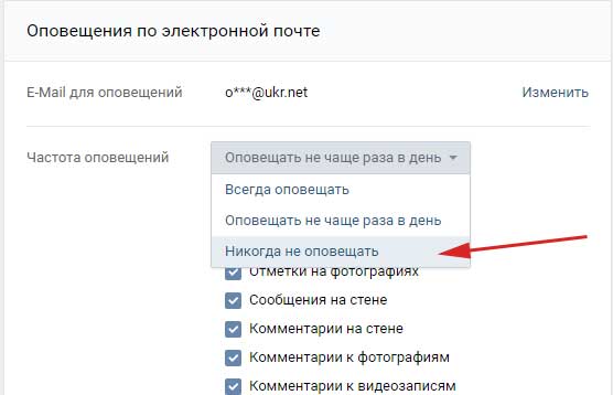 Якщо взагалі хочете відключити оповіщення по пошті, то навпроти пункту «Частота сповіщень» вибираємо «Ніколи не сповіщати»: