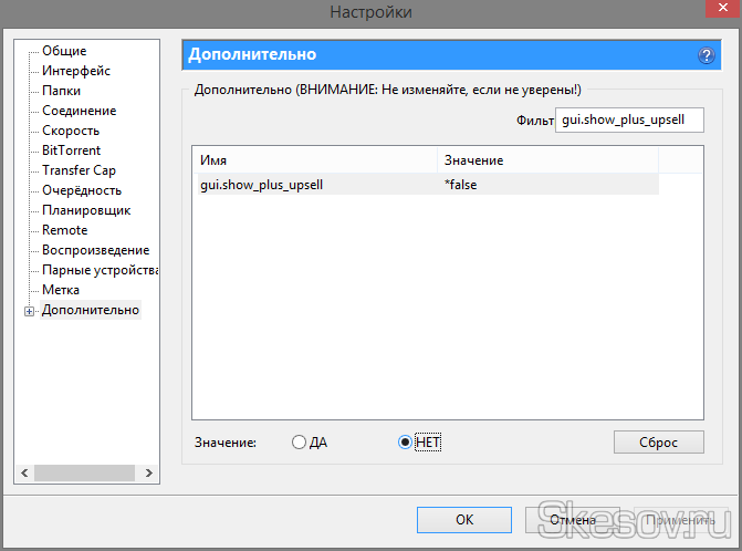 5) Але тепер з’явиться в нижньому лівому куті буде відображатися пропозицію про покупки про версії програми. Відключаємо і її. Так само, через фільтр шукаємо параметр «gui.show_plus_upsell» і переводимо його в режим «False».