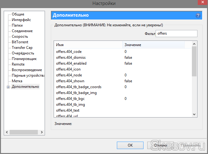4) Шукаємо параметри «offers. left_rail_enabled» і «offers.sponsored_torrent_offer_enabled», зазвичай вони в самому низу списку. Перемикаємо обидва в режим «False«, для цього вибираємо кожен і внизу вікна переставляємо крапку на «Ні». Це прибере рекламу зверху і знизу ліворуч.