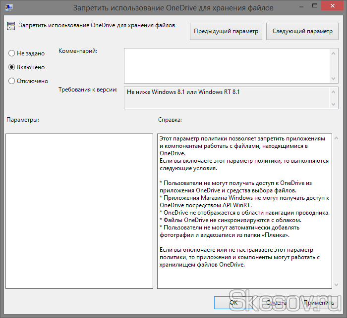 3) У правій частині вікна двічі клікаємо по «Заборонити використання OneDrive для зберігання файлів» і у вікні ставимо крапку на «Включити». Тиснемо ОК.