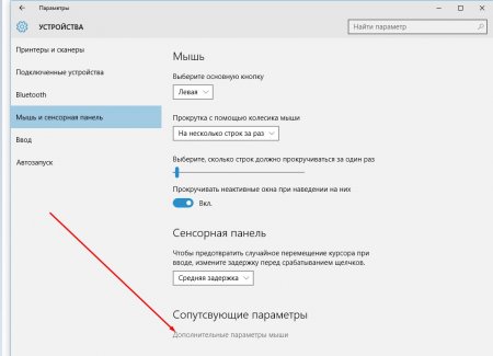 Відкриється вікно «Пристрої» з різними налаштуваннями. Зліва відшукайте і виберіть вкладку «Миша і сенсорна панель». У цій вкладці внизу ви побачите текст «Додаткові параметри» натисніть на нього.