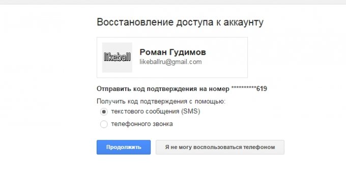 Тут вже підключаються дані, які ви вказували під час реєстрації, а саме ваш номер телефону. Google приховує весь номер телефону і показує останні три цифри, якщо вони від вашого телефону, то все просто. Натискаєте «Продовжити» через 10-20 секунд вам прийде СМС з кодом, який після введення впустить вас в аккаунт і попросить вказати новий пароль, який ви вже запишіть і не забудете.