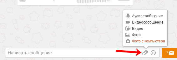 Тепер у полі для введення повідомлення, праворуч, ви побачите скрепочку, натисніть на неї. З її допомогою, ви можете прикріпити до листа додаткові файли. Нас цікавлять останні два пункти.