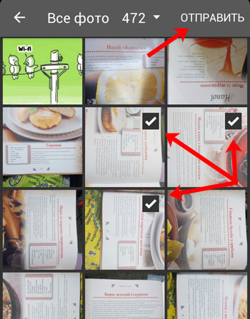 Відкриється список фотографій, які зберігаються на вашому пристрої. Натисніть пальцем по тим, які хочете відправити, щоб виділити їх. Після цього натисніть на кнопку «Відправити» в правому верхньому кутку.