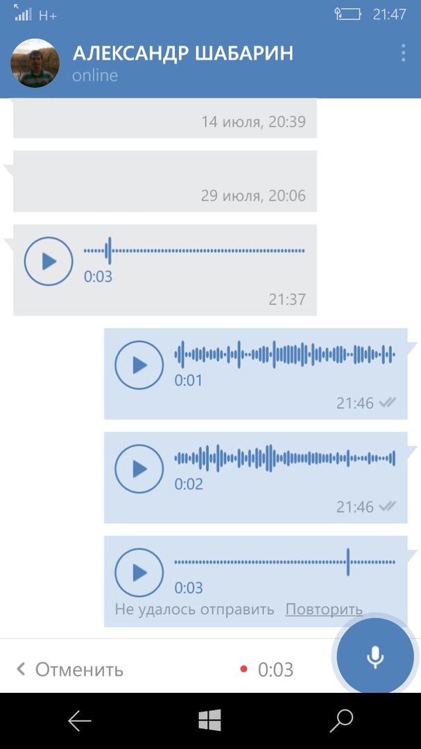 Розробники офіційних додатків Вконтакте впровадили даний функціонал для всіх операційних систем: windows phone, iphone, android. Тепер будь-хто може написати повідомлення другові, використовуючи мікрофон, який присутній в кожному телефоні (без нього ніяк). Що з айфона, що з android — просто переходимо діалог з користувачем , утримуємо іконку мікрофона і проговорюємо зміст послання. Для зупинки потрібно просто відпустити палець і ви можете його відправляти. Щоб скасувати дію і видалити голосове повідомлення, досить змахнути палець ліворуч. На windows phone запис виглядає так: