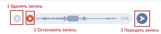 Після кліка на мікрофон відбувається запис — говоримо, що збираємося передати. Як зупинити вилучити і надіслати звукове повідомлення намалював для вас на картинці