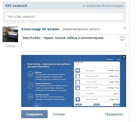 У всіх користувачів Вконтакте на особистій сторінці є розділ «Стіна», куди кожен може викладати все, що душі завгодно: різні фотографії, цікаві посилання, актуальні новини, вподобані аудіозаписи і зробити репост чого завгодно з будь-якої спільноти або зі стіни одного. Буває, що ви виклали неправильну інформацію або фотографію поганої якості, та мало що не так і потрібно відредагувати помилковий запис. Як це зробити ми дізнаємося в даній статті.