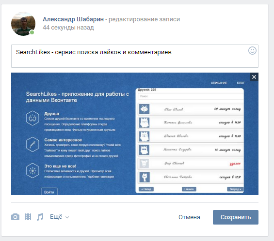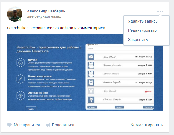 Запис на стіні в новому інтерфейсі Вконтакте виглядає так: