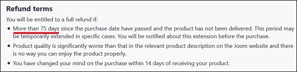 Термін безкоштовної доставки товару згідно умов «Joom» становить до 75 днів (при цьому в правилах ресурсах також зазначено, що цей термін може бути продовжений в деяких випадках, про що ви будете повідомлені додатково). Зазвичай називається термін доставки до 15-45 днів, що, в більшості випадків, не відповідає дійсності.