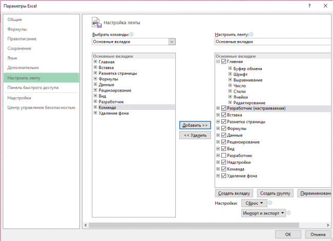 По-перше, необхідно відкрити документ, і вибрати ті клітинки, які вже були опрацьовані. По-друге, потрібно відобразити у стрічці Вкладку розробника». Щоб це зробити, необхідно відкрити «Файл» вибрати «Параметры», і таки виставити значення, які є на зображенні.