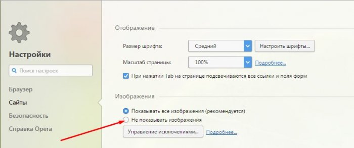 3. Знаходимо розділ Зображення і встановлюємо прапорецьНе показувати зображення».