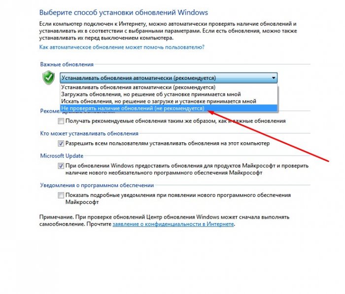Потім у розділі “Важливі управління”, зі списку, що відкривається, встановлюємо «Не перевіряти наявність оновлень» і натискаємо кнопку ОК.