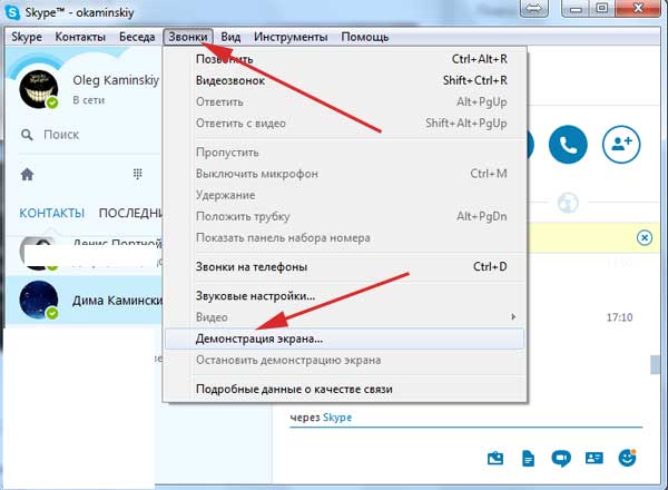 Якщо ви ще не зателефонували людині, але вже заздалегідь знаєте, що будете демонструвати екран, то можна поступити наступним чином. Заходимо в «Контакти» і знаходимо потрібний нам. Далі правою кнопкою миші клікаємо по контакту і з випав списку вибираємо пункт «Демонстрація екрану…»