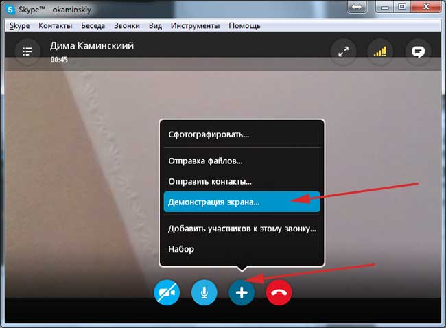 Для цього нам знадобиться менюшка, яка знаходиться внизу вікна видеоразговора. Натискаємо на «плюсик» і з випавшого меню вибираємо пункт «Демонстрація екрану…»